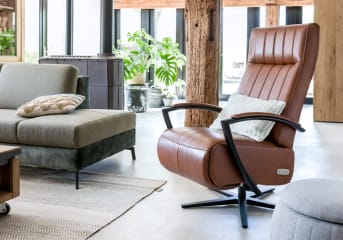 Dieser moderne Relaxsessel Aruba kann nach eigenen Wünschen und Geschmack bezogen werden. Sie können zwischen Stoff, Leder oder einer Kombination wählen. Der Sessel steht auf einem stabilen schwarzen Sternfuß. Ein auffälliges Detail ist, dass der Bezug des Stuhls auf den schwarzen Metallarmlehnen wieder auftaucht. Diese Version von Aruba ist manuell in eine angenehme Relaxposition verstellbar.