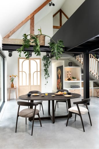 L'Almora est une table de salle à manger au design à la fois moderne et vintage. Son pied design plaqué lui confère un caractère résolument moderniste. Elle s’intègre parfaitement dans un intérieur art nouveau, mais trouve tout autant sa place dans un salon contemporain. Un véritable intemporel. La table Almora est disponible en trois dimensions. Voici la version avec un plateau de 240 cm de long, 120 cm de large et 77 cm de haut. Elle est également proposée avec un plateau de 210 cm ou 270 cm. Son plateau est en chêne massif. Le modèle présenté ici est en teinte basalt, mais elle existe aussi en coloris natural sand.